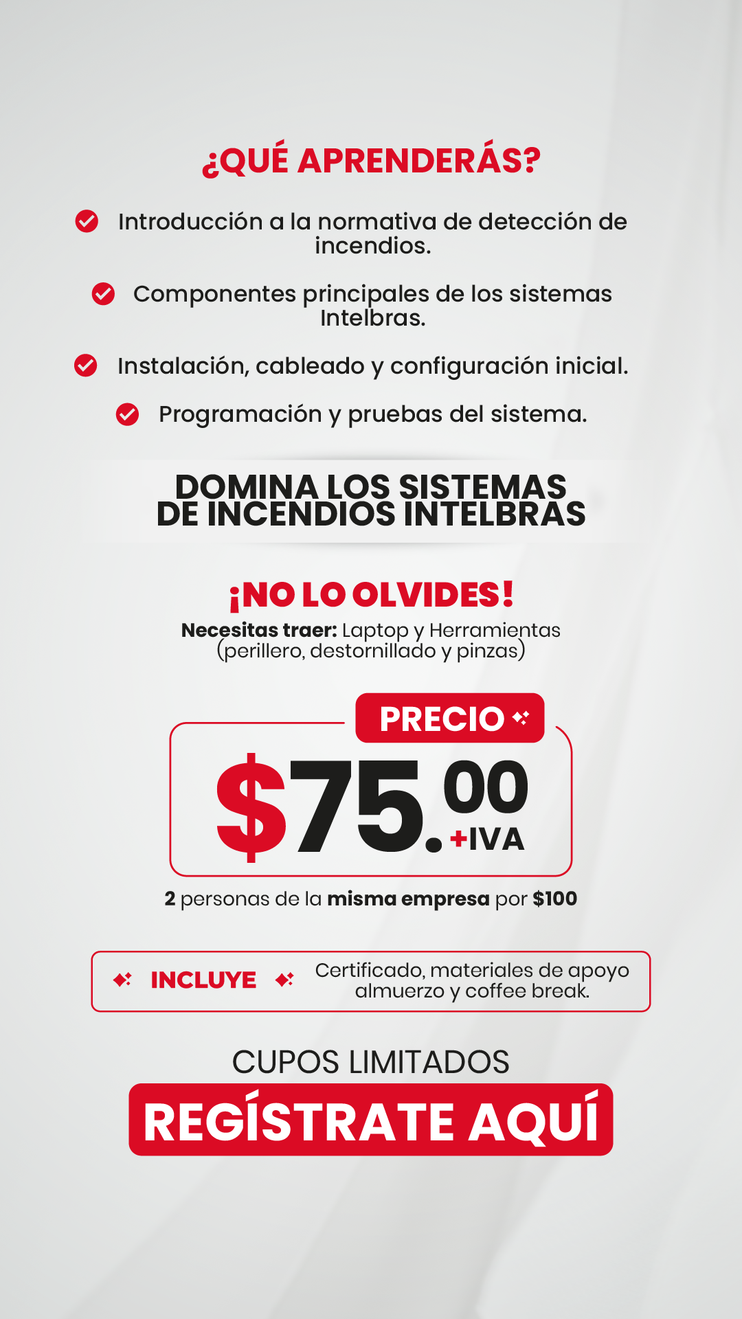 Prepárate para una jornada intensiva donde aprenderás a instalar, configurar y certificarte en sistemas de incendios Intelbras, de la mano de un especialista LATAM.