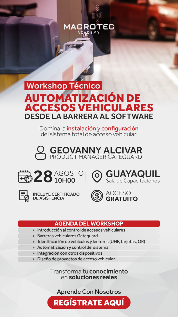 En este espacio técnico y práctico, los asistentes podrán comprender e implementar soluciones completas para automatizar el acceso vehicular, desde los dispositivos físicos hasta la configuración del software.